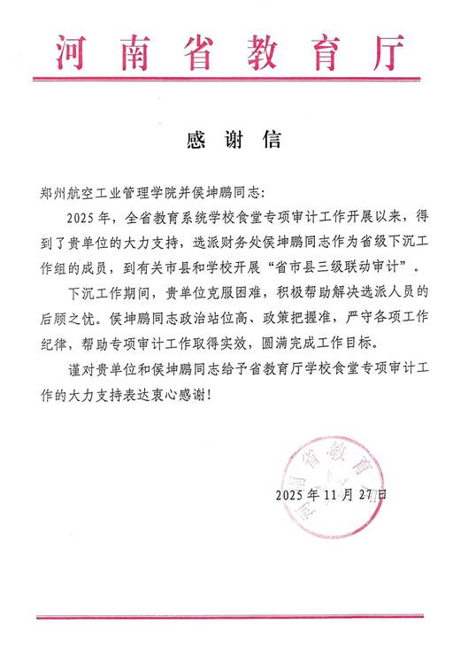 近日,我校收到来自省教育厅的感谢信。信中对我校和侯坤鹏同志给予省教育厅学校食堂专项审计工作的大力支持表达了衷心感谢。